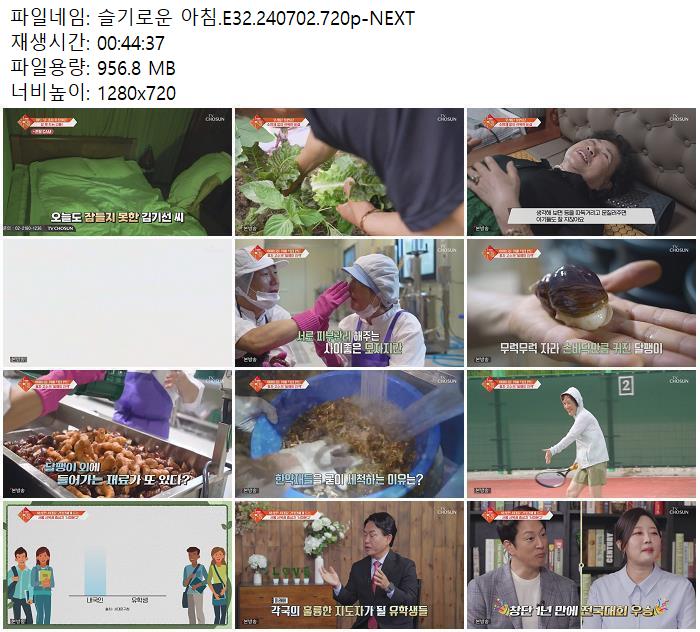 | 슬기로운 아침.E32.240702.720p-NEXT.mp4 | 956.8 M | - | 1280x720 |